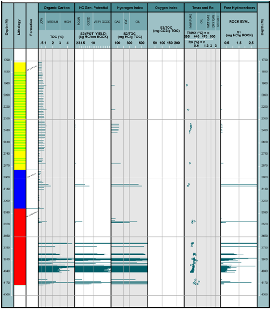 - Geochemical log showing TOC and Rock Eval data of selected sediment samples from Macaé Formation. These sections occur in most wells drilled in the Central and Eastern part of the basin, and is known as the Bota sequence. Generally, its thickness reaches up to 200 meters, most of them organic-rich.